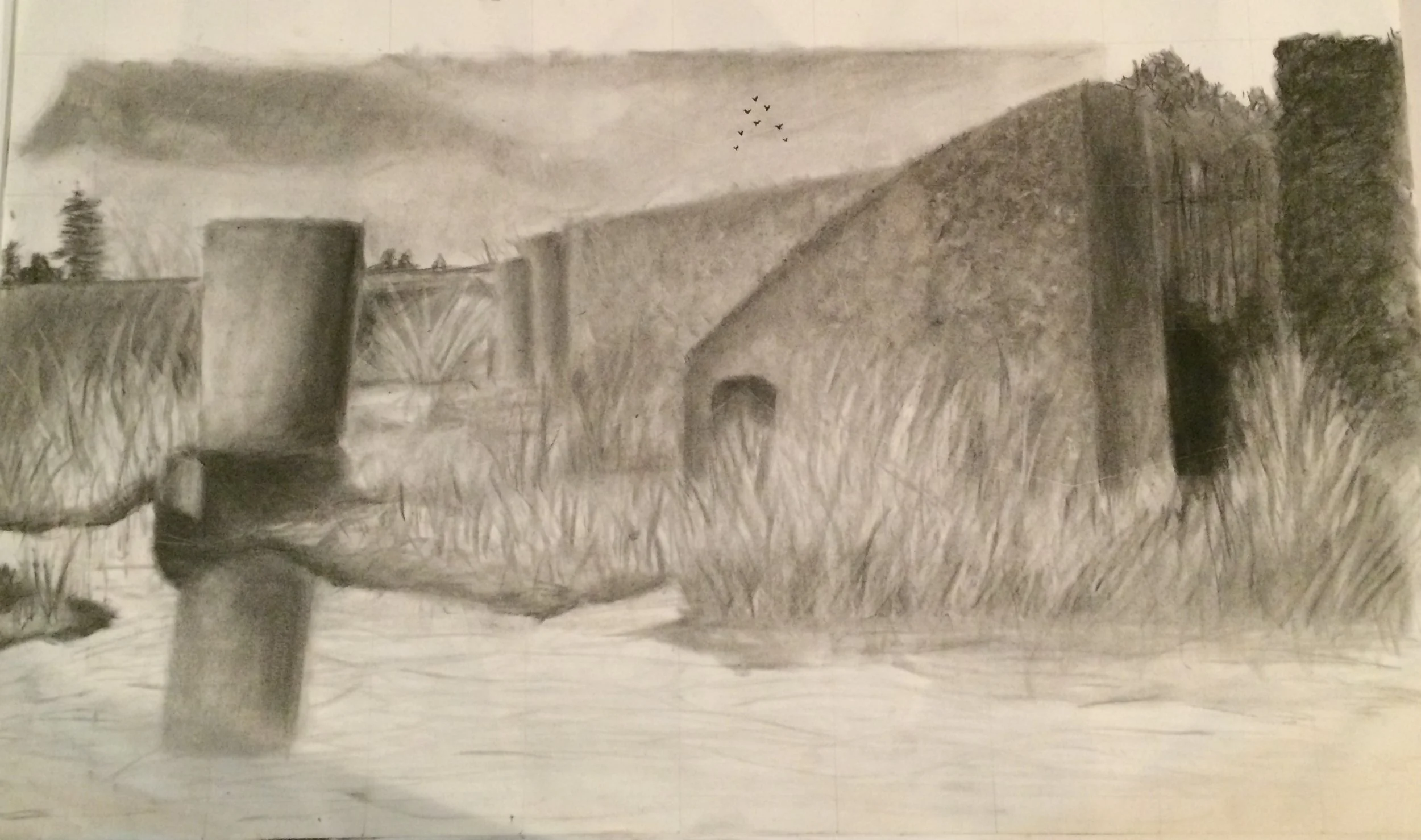 The first picture is an experimentation with the common two-thirds rule, where an object is placed off-center in order to make a piece more interesting. In this case, the outside hedge fulfills this purpose. This piece started with basic shapes, then shading, and finally filling out the details. I also just love the nature aspect of the manmade features of the hedge. Not only that but the simple gray and shading remind me of growing up in Washington where the predominant color 9 months of the year is grey tones or almost in a world slightly asleep.